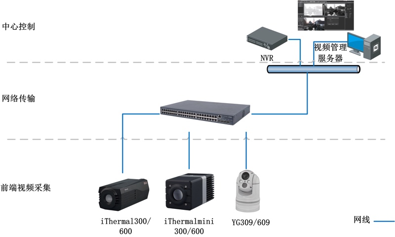 系統(tǒng)由前端雙波段攝像機(jī),網(wǎng)絡(luò)傳輸和后端監(jiān)控室組成。